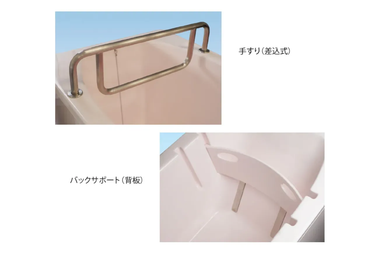 リフトを使わずに入浴する際は、付属の差込式の手すりとバックサポート(背板)をご利用ください。入浴動作を補助し、安全性を高めます。
