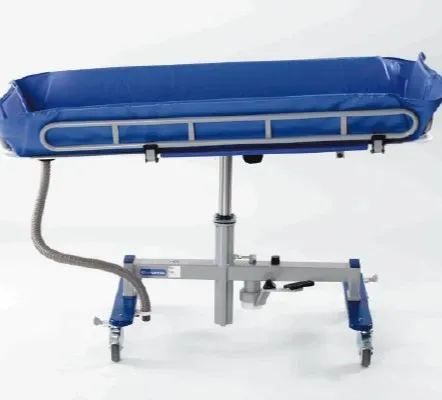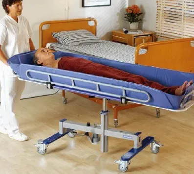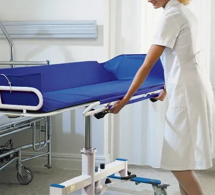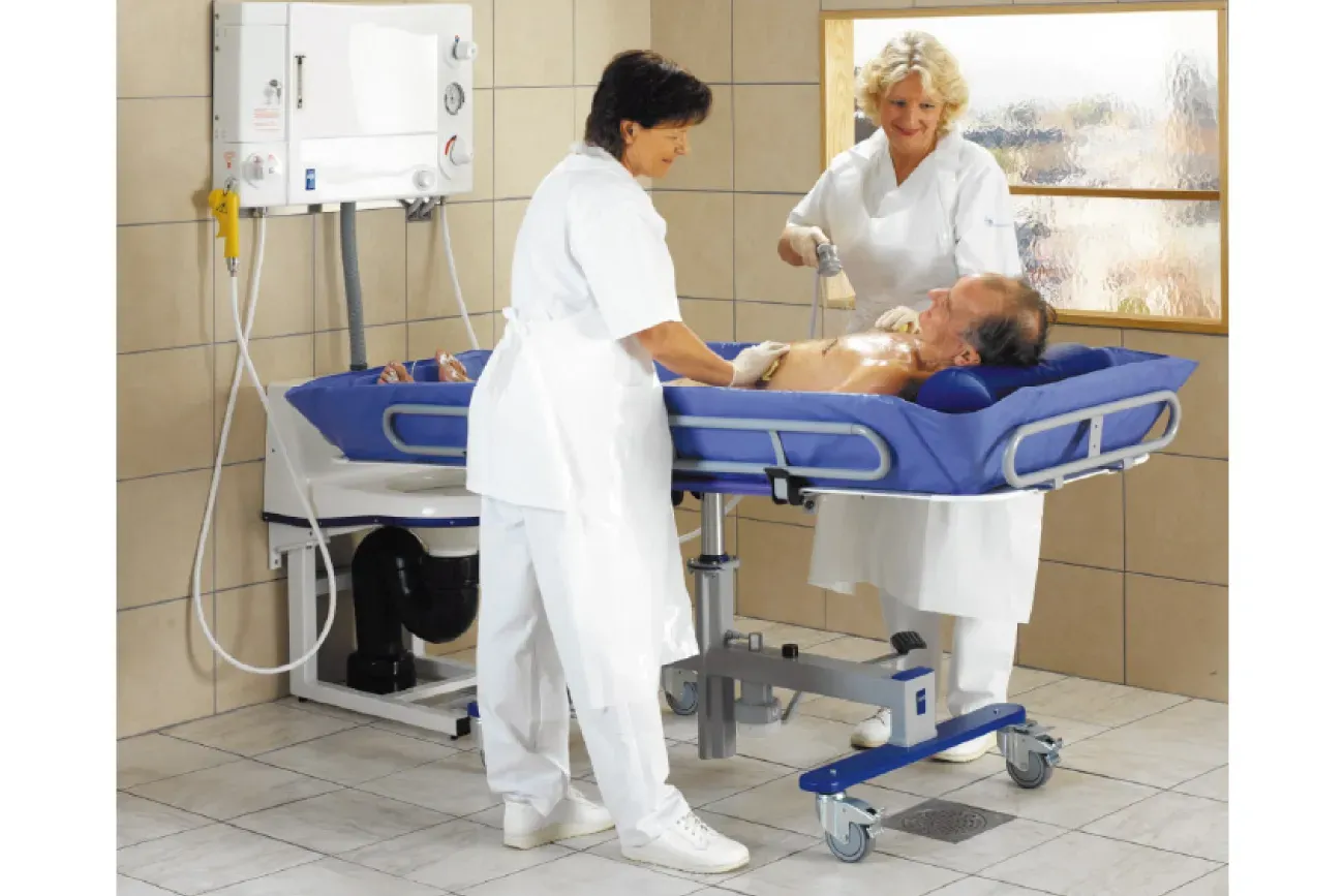 足踏みペダルによる油圧昇降式で、介助の手を離すことなく操作できます。 - ベッドや脱衣台から直接移乗し、そのまま浴室へ移動してシャワー浴・洗身ができます。