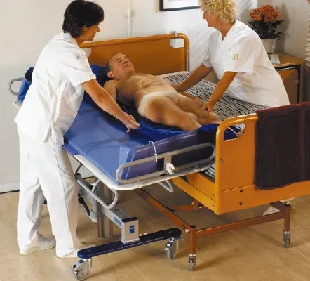 シャワートロリーをベッドや脱衣台に重ね合わせ、スライディングシートなどを用いて移乗します。