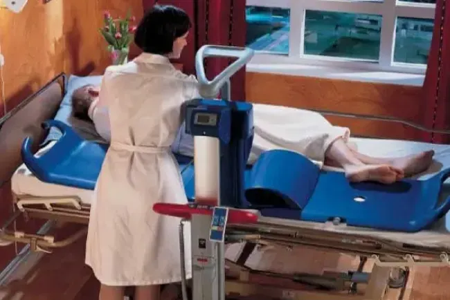 ストレッチャー部の高さを調節し、ベッドや脱衣台に重ねます。次に、スライディングシートを用いるか入浴者を反転させてリフトトロリーに乗せます。背もたれの角度を調節し、固定します。
