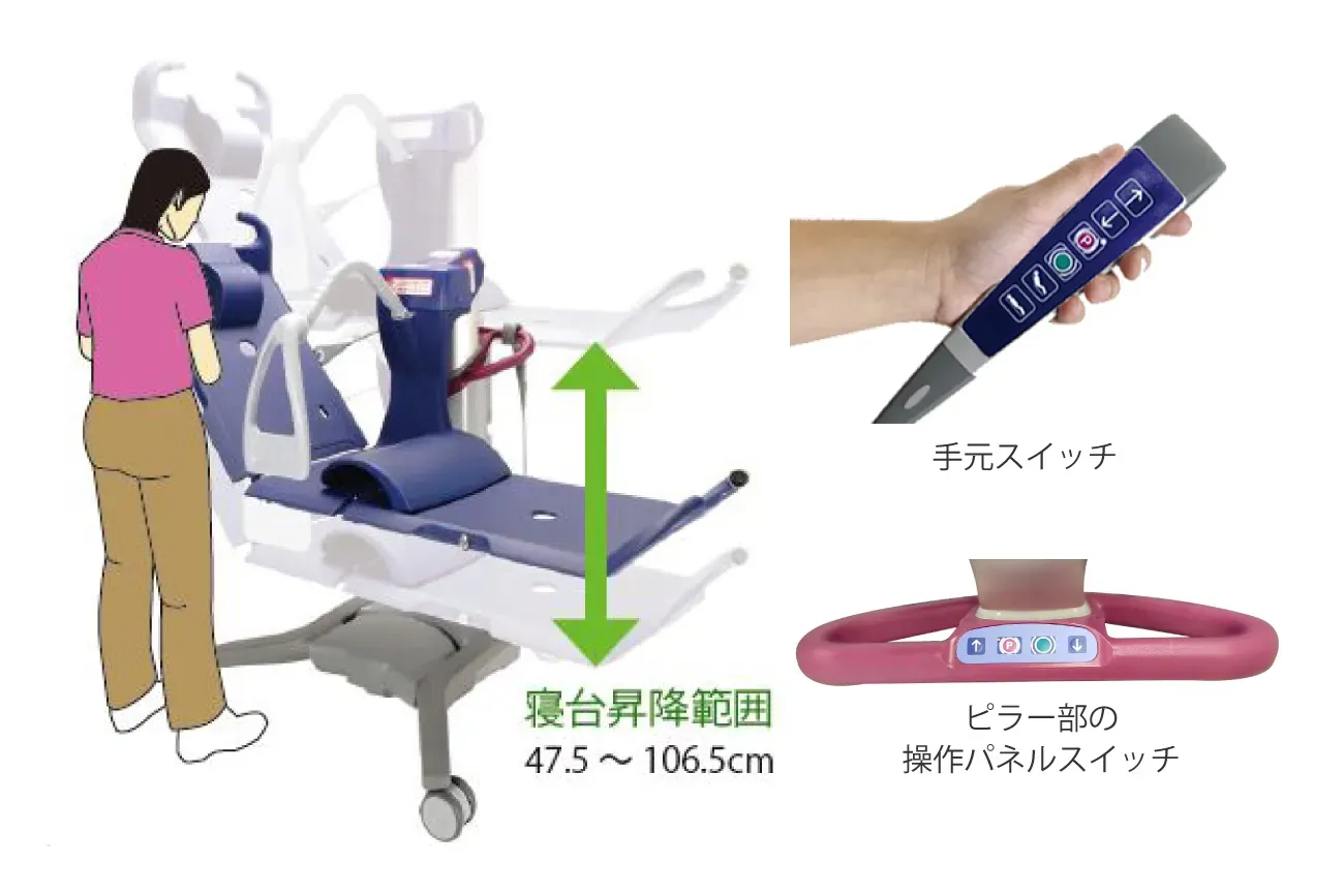 手元スイッチ操作またはピラー部の操作パネルスイッチで寝台部が電動昇降します。