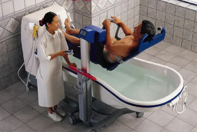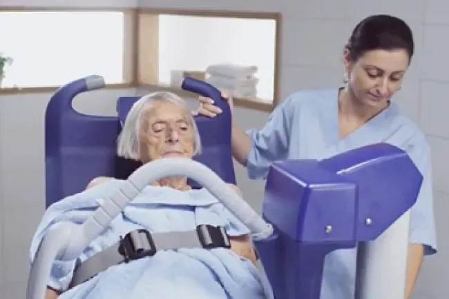 浴槽の上まで移動させ、手元スイッチの昇降ボタンを押して、入浴者を湯の中に降ろします。入浴後は、リフトトローリーに乗せたまま入浴者の身体の水気を拭き取り、ベッドや脱衣台に戻します。
