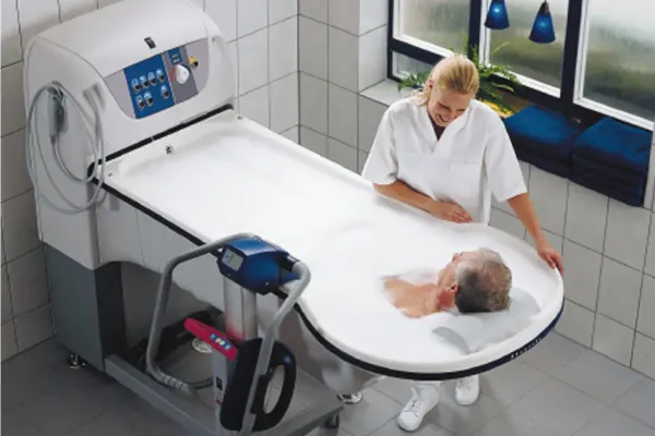 アルジョの特殊浴槽と組み合わせ、座位を保つことが困難な方の入浴をサポートする臥位浴用ストレッチャー。