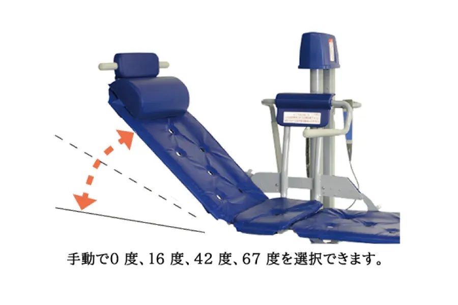 | 背もたれ角度 | 手動操作により、3段階の角度で固定可能(16°/ 42°/ 67°) | |