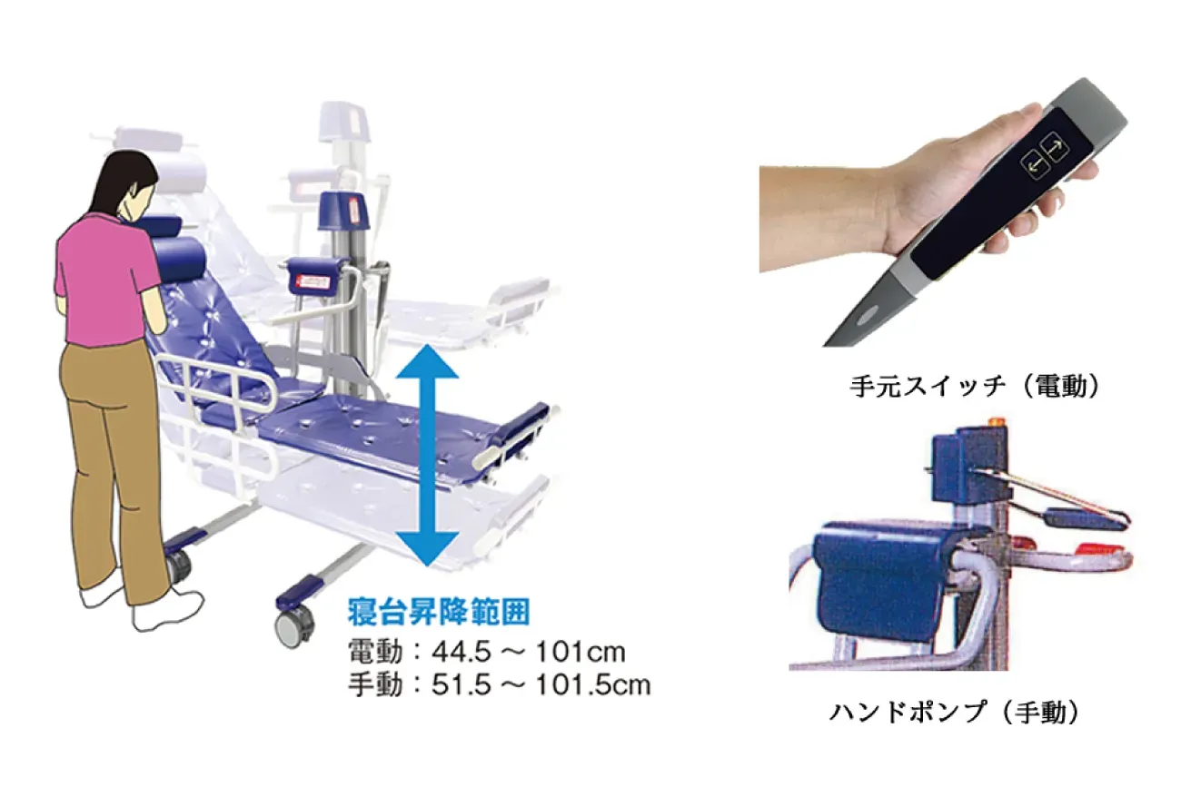 手元スイッチ(電動)またはハンドポンプ(手動)操作で寝台部が昇降します。