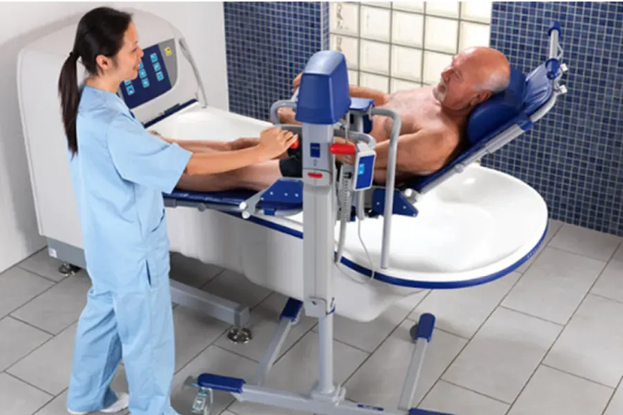 寝た姿勢のまま入浴できるリフト。シートは外して洗浄できます。