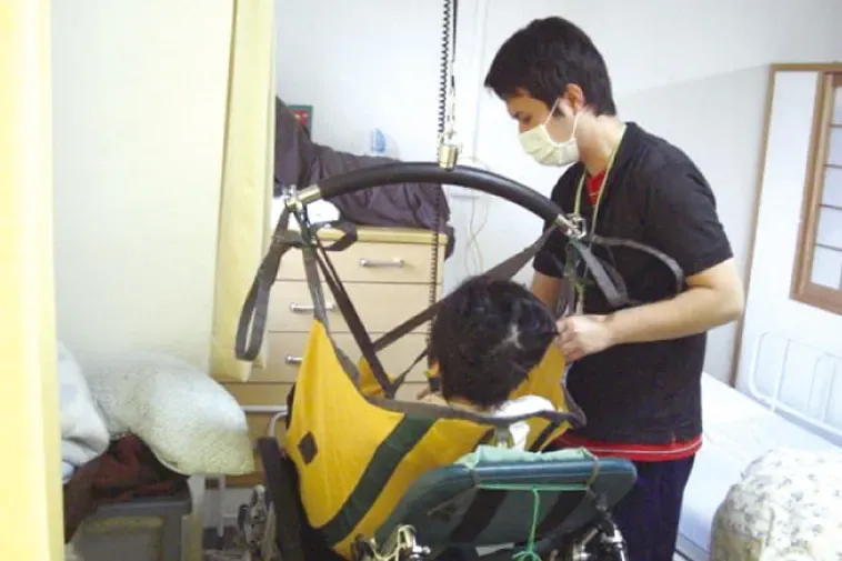 予め施工したレールに沿って浴室等へ移動できます。支柱などが無いため、介助スペースを広く、有効に活用できます。訓練やケアにも活用が広がっています。