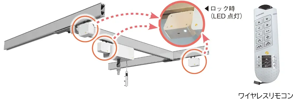 リモコン付機種は、有線手元スイッチ、ワイヤレスリモコンのいずれかで操作できます。ワイヤレスリモコンで電動レールシステムの操作も可能です。