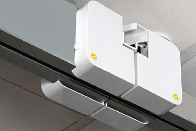 部屋内の移動レールと、他の部屋へのレールの接続を可能にしたのが独自の方法「コンビロックシステム」です。レールが正確に接続されたときにだけストッパーが解除される安全装置付き。