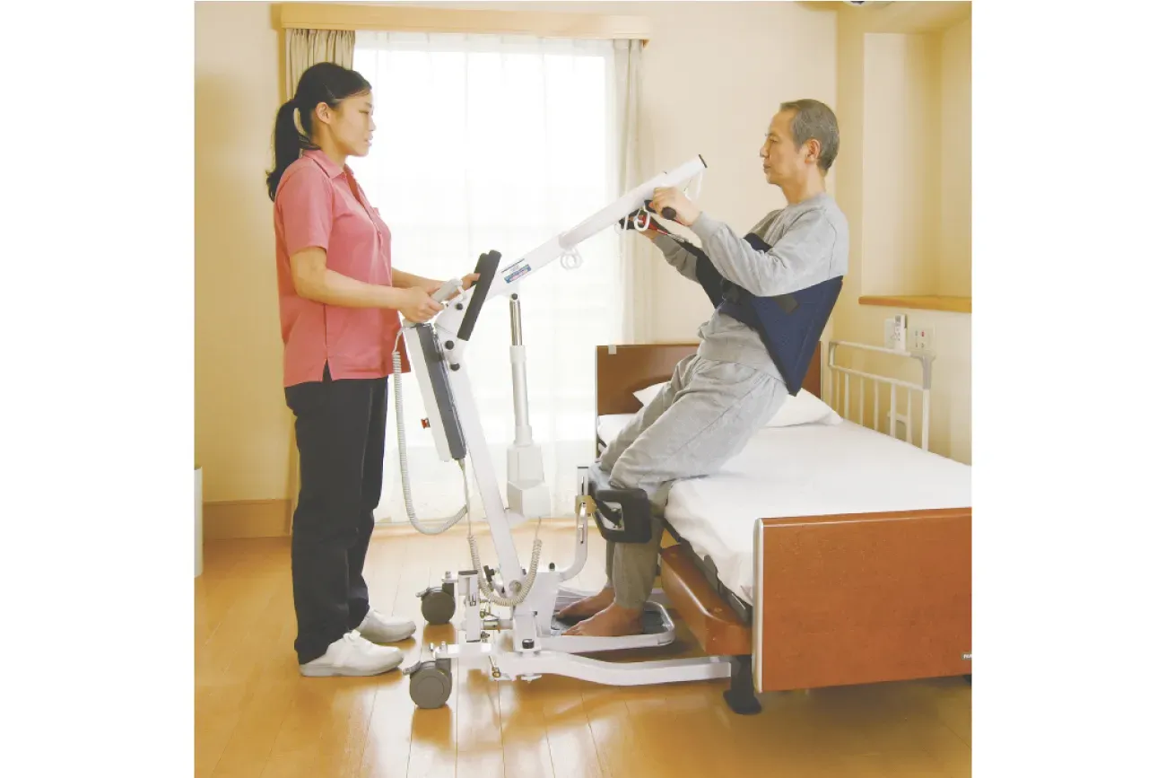 ご利用者の残存能力を活かしながら、座位から座位への移乗をサポートします。 電動式で、小柄な方でも安心して移乗介助ができます。