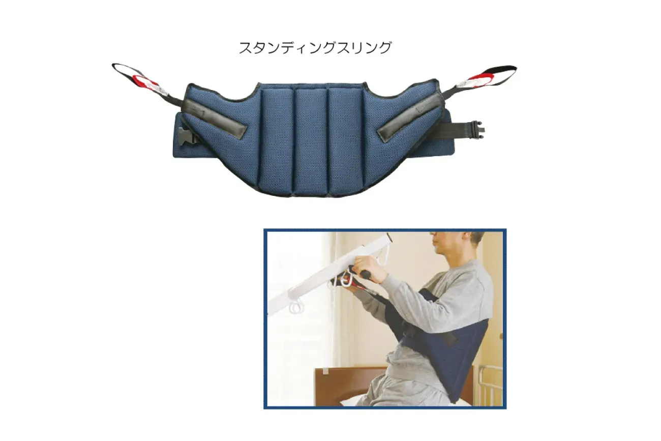 - 専用のスタンディングスリング(別売)を使用し、座位から座位への移乗をサポートします。ご利用者の体格に合わせ、かけるフックを選ぶことで、快適なスタンディングポジションがとれます。