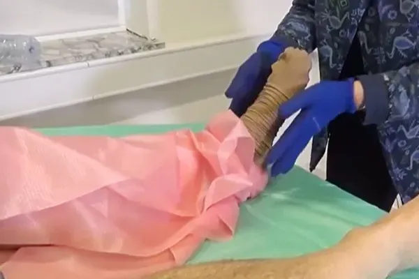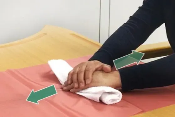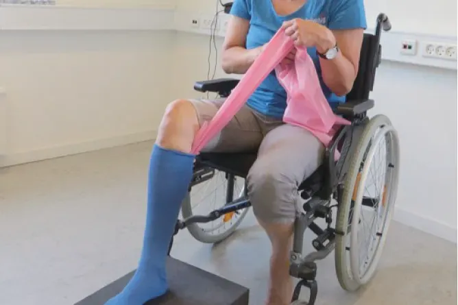 介助による弾性ストッキングの履かせ方(ピンク 150×50㎝使用)