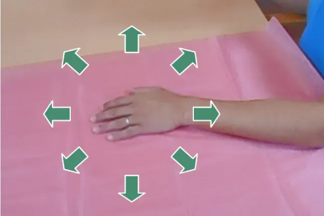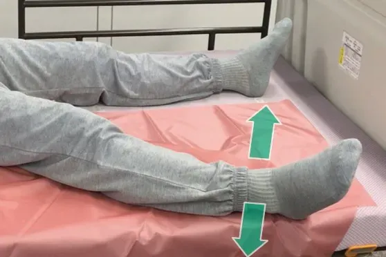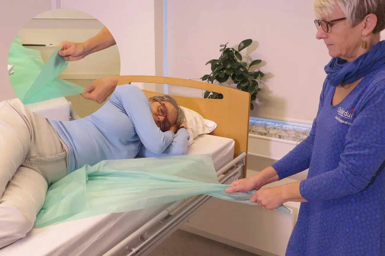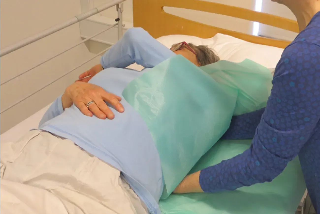 臥位で2枚のシートを1人で敷き込み。(グリーンまたはブルー 100×150㎝使用)