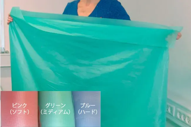 滑りやすい素材でできており、硬さ(斜めに引っ張ったときの弾力性の差)により、ブルー(ハード)、グリーン(ミディアム)、ピンク(ソフト)の3種類があります。