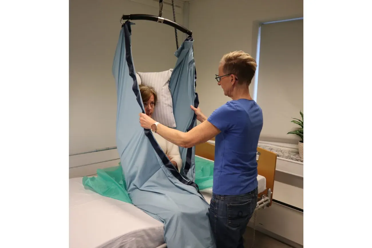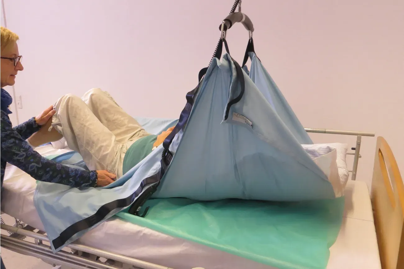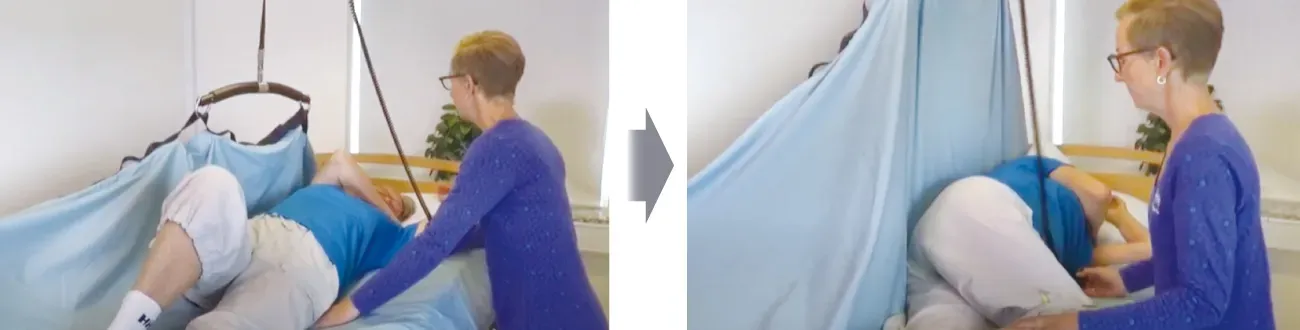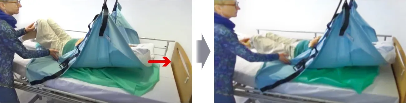 用途により、2 人介助で使用する方法もあります。体位変換、臥位位置の修正には、介護リフトと共に利用します。