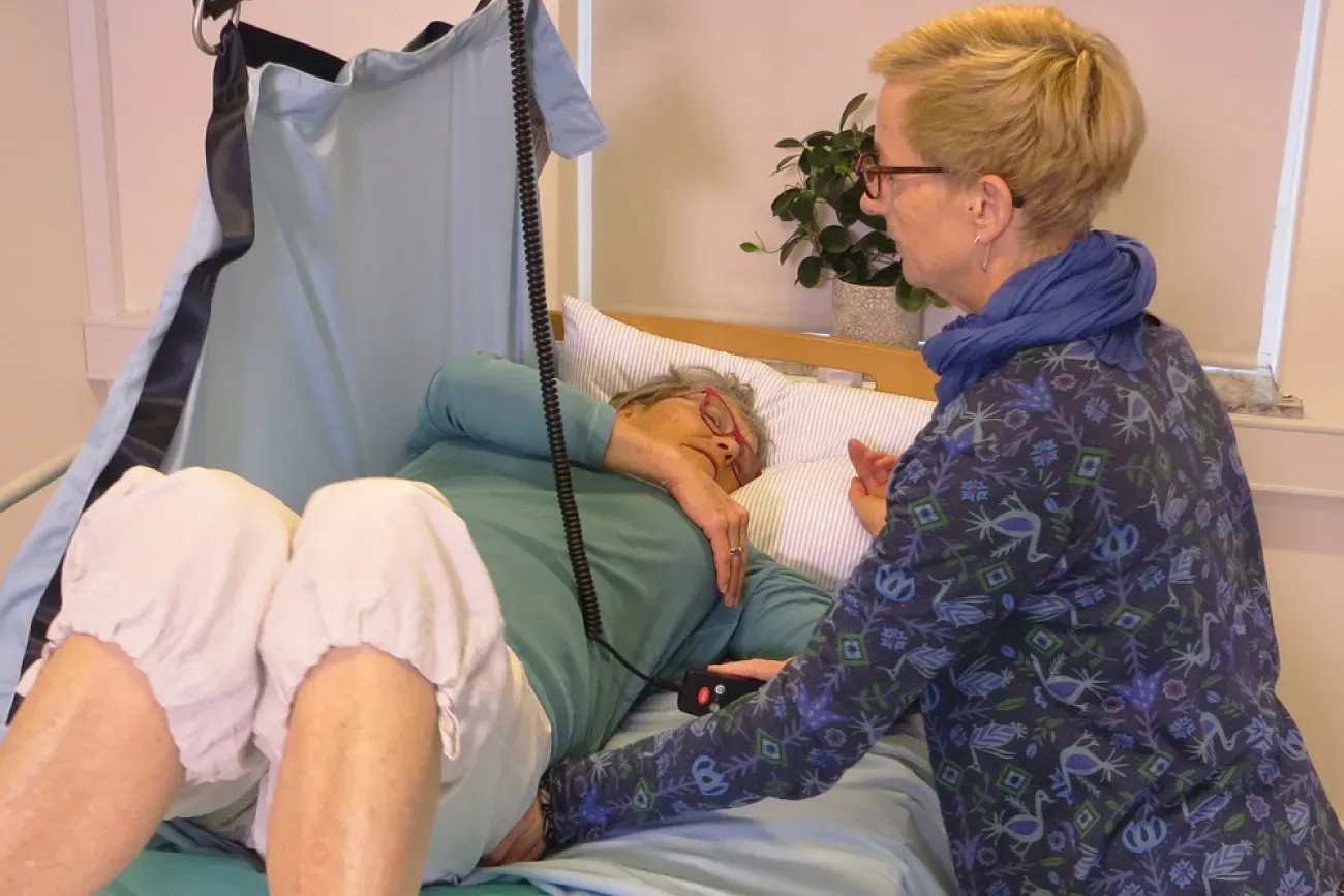 リフトで側臥位を維持しベッドでの排泄ケアに活用。