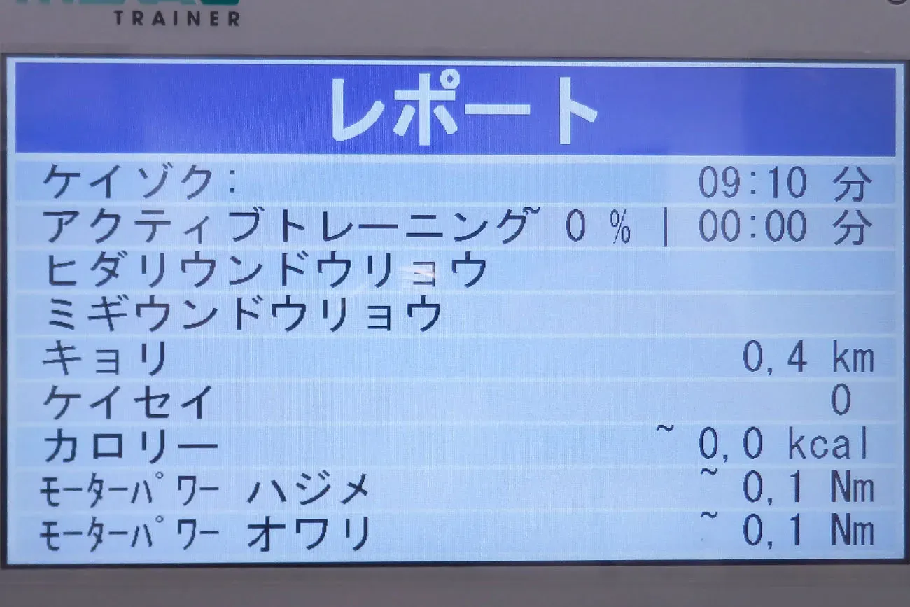 トレーニング内容と実施状況、終了後のレポートを確認できます。 レポートでは、走行距離、抵抗運動(利用者が自分でペダルこいだ)の時間の比率、左右それぞれの抵抗運動の比率が確認でき、記録することで運動の評価に活用できます。