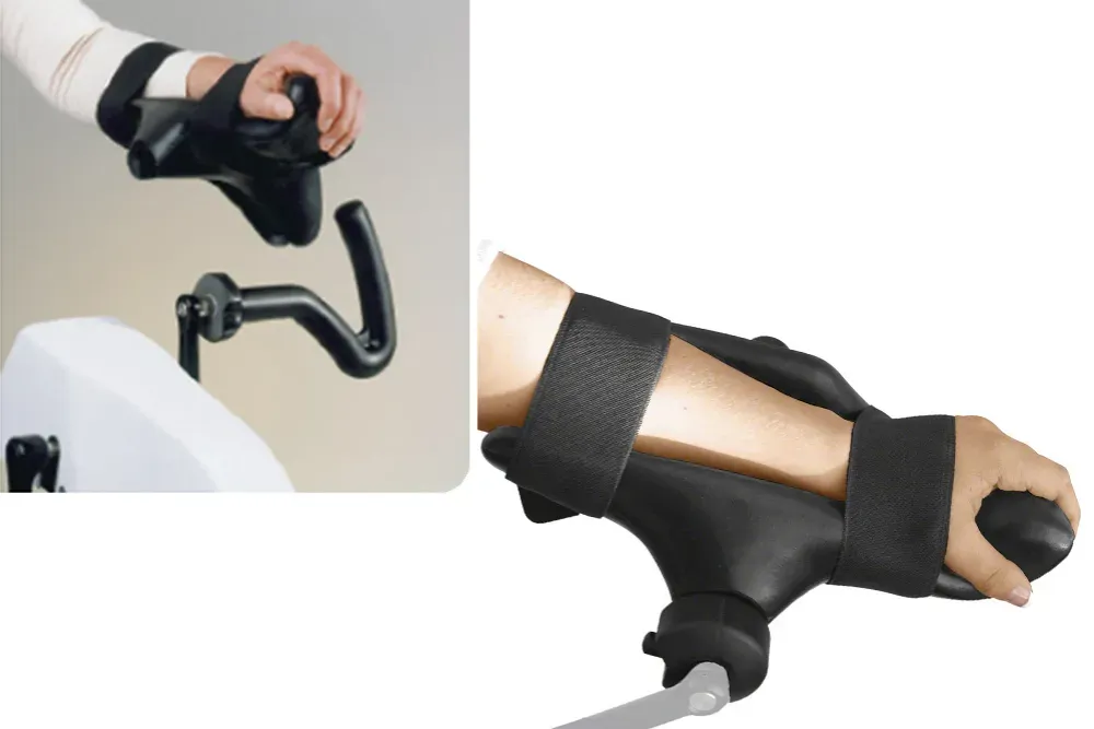 握力が弱く、ハンドルが握れない方向け。上肢訓練付専用オプションです。