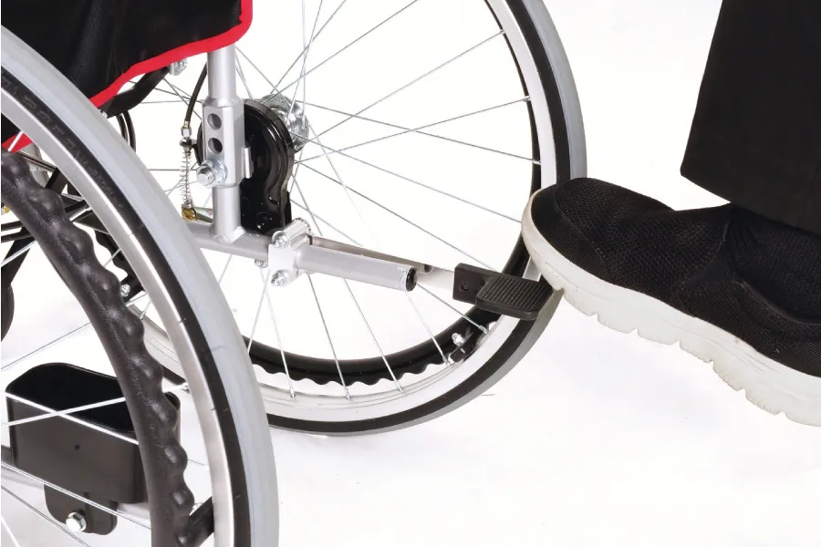 足踏みペダル(右)の操作で、左右両側のブレーキ操作が可能です。