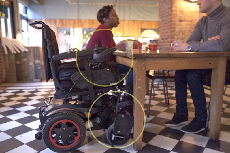 スイングアウェイレッグサポート(写真、下の〇マーク)とジョイスティックコントローラーのパラレルスイングアウェイ(写真、上の〇マーク 標準)で、アームパット外側にワンタッチでスイング(格納)でき、レストランなどのテーブルや机により近づくことができ、移乗も妨げることなく対応できます。
