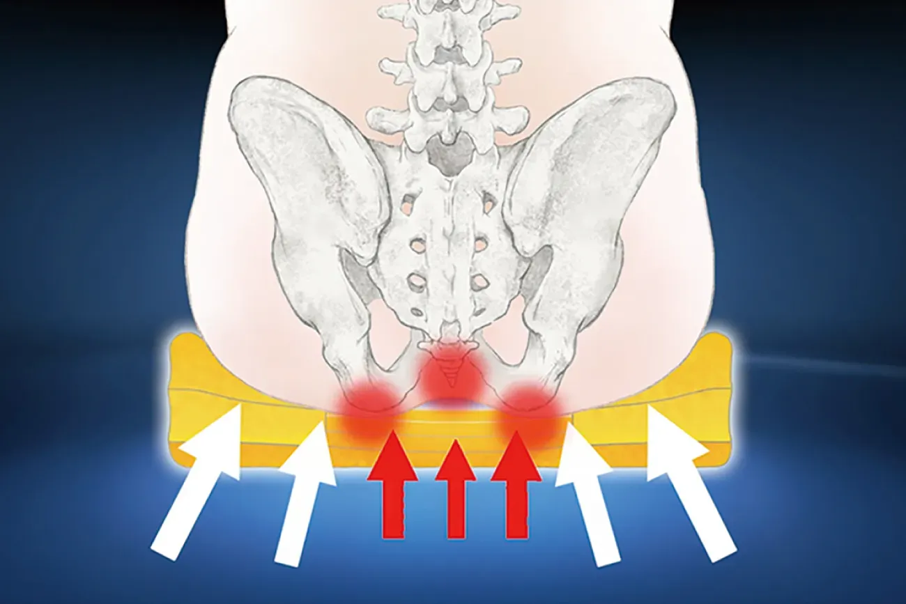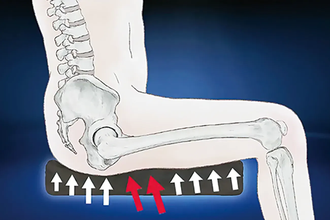 臀部外側と大腿部に体圧を分散させることで良好な血液循環を保ち、坐骨や仙骨などの骨が突出した部分への負荷を軽減します。