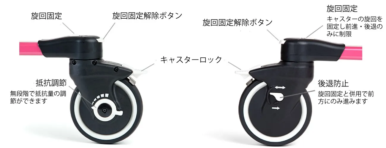 キャスター4輪にはそれぞれ抵抗量調節、旋回固定、後退防止、ロック機能があり、利用者の身体状況、歩行の改善に合わせて調節できます。