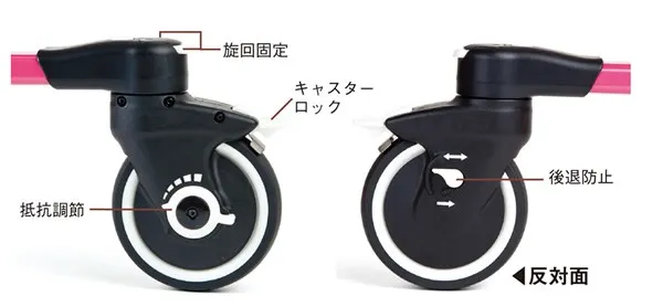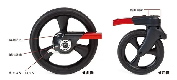 屋外または屋内で使用します。特に外のデコボコした地面での使用を想定した設計です。 前輪2輪に旋回固定、後輪2輪にキャスターロック、後退防止、抵抗調節の機能があります。後輪は自在キャスターではないため後方支持としての使用は推奨していません。