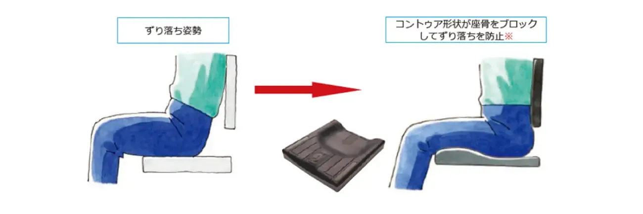 座骨前方でブロックしずれをおさえ、骨盤を正しい傾きで保持して姿勢保持を提供します。ずれによる床ずれ(褥瘡)も予防します。