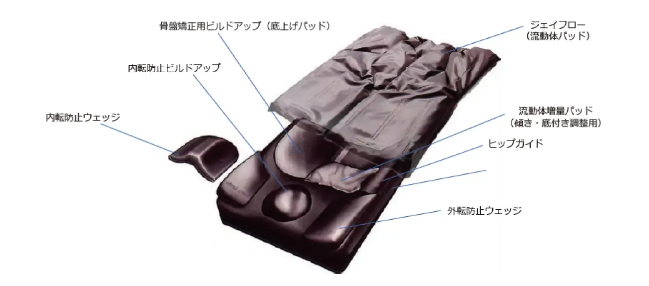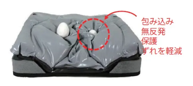 ※流動体に沈み込ませて座骨や大転子のブロックを行うことで骨ばった部位を保護しながらずり落ちを防止します。