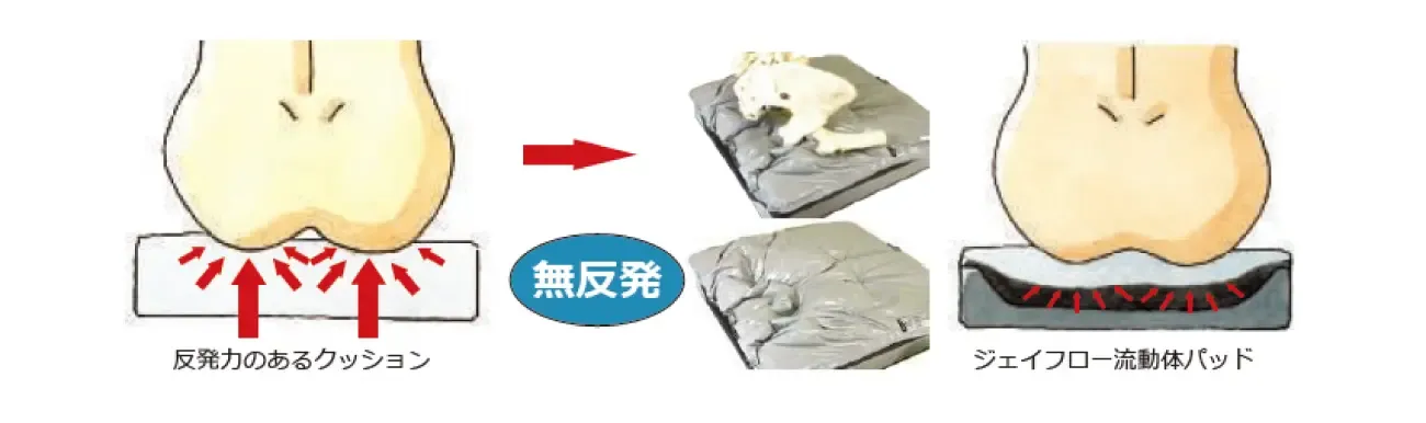 床ずれ(褥瘡)予防・再発防止のため、製法特許の流動体『ジェイフロー』により、流動体も移動せず、無反発状態となり、包み込んでショックを吸収し均衡があり、快適性の高い座位保持を提供します。